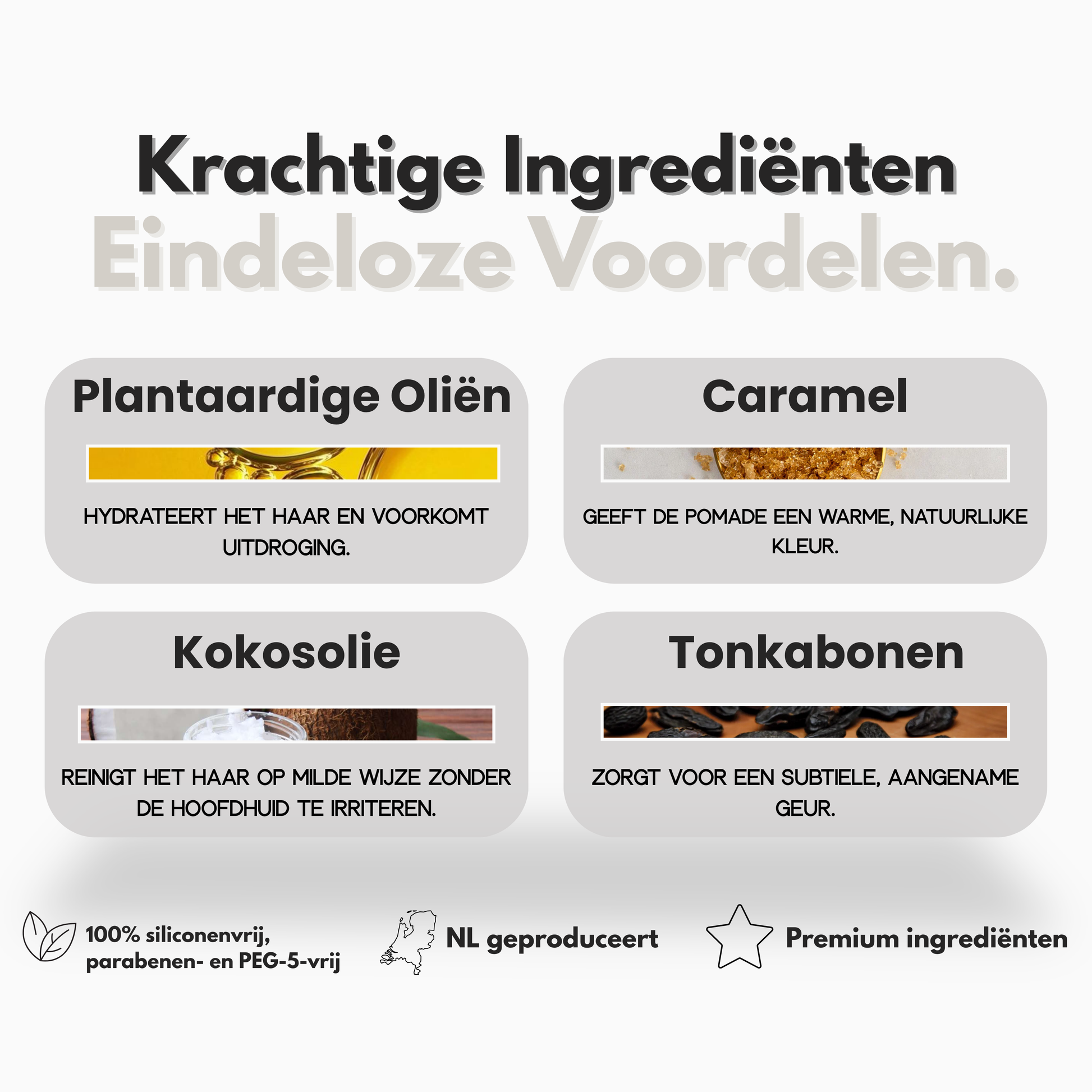 In tegenstelling tot veel klassieke pomades die vol zitten met kunstmatige stoffen en zware oliën, is de HEWI Pomade ontwikkeld met enkel natuurlijke ingrediënten. Geen chemische geurstoffen, geen troep – alleen pure, plantaardige verzorging die je haar in model houdt en je hoofdhuid gezond laat aanvoelen.